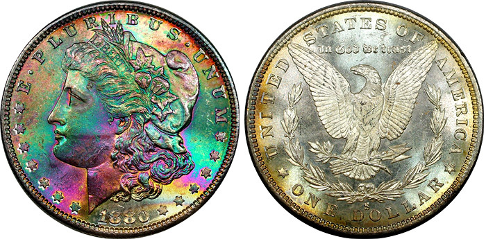 View the largest gallery of high-end and Monster rainbow toned Morgan dollars, an informational guide on how to tell natural vs. artificial toning, learn to price toned Morgans, view auction results of rainbow Morgans, and view what characteristics to look for in high-end toned rainbow Morgan dollars.