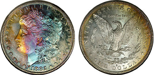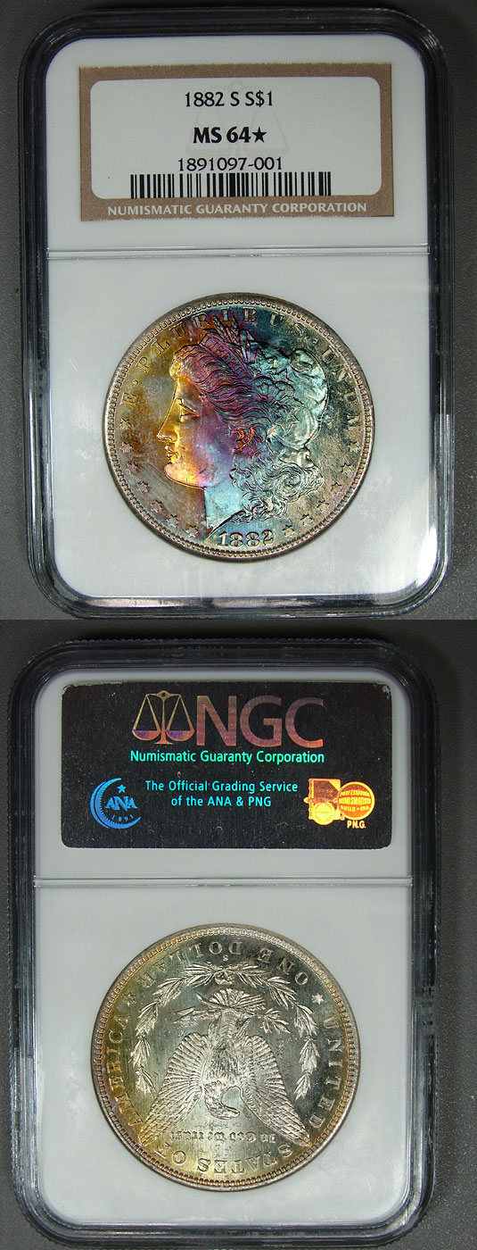 1882-S $1 NGC MS64* Blue Pink Gold Textile Toned Morgan