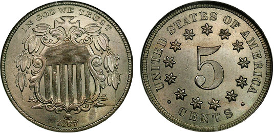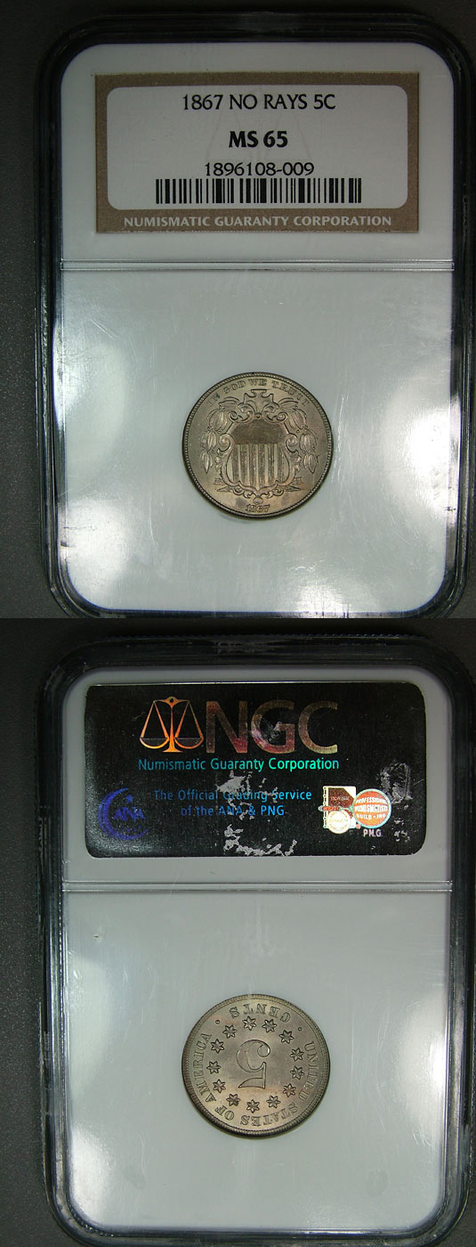 1867 5c NGC MS65 No Rays Shield Nickel