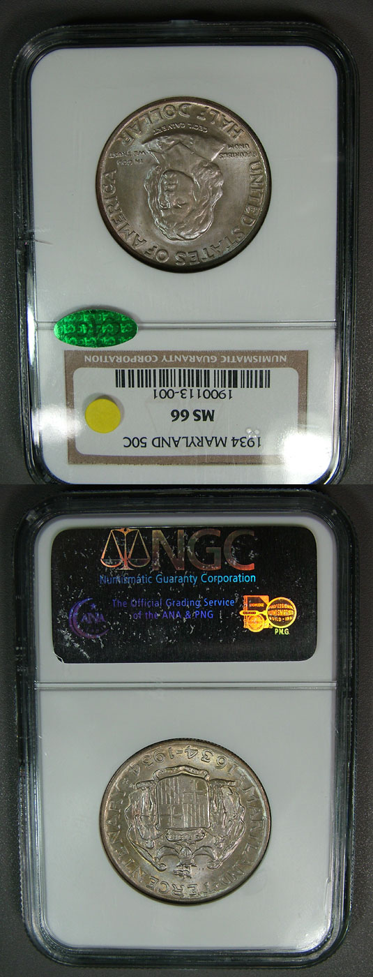 Nicely Toned 1934 50c NGC MS66 Maryland Commemorative Half Dollar deservingly designated "CAC". Boldly struck and dripping in luster, this beautiful Gem piece is dusted with soft pastel toning and is quite pleasing!