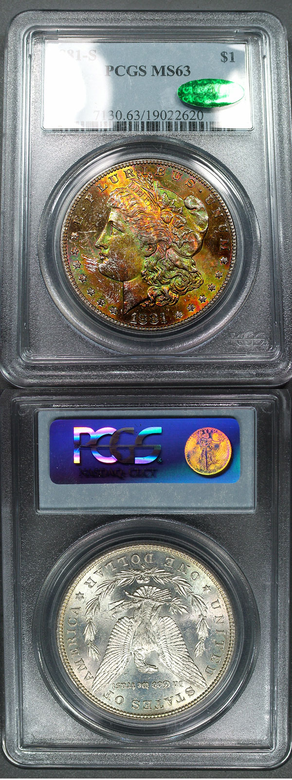 1881-S $1 PCGS MS63 CAC Shrek-Textile Rare Color Rainbow Morgan