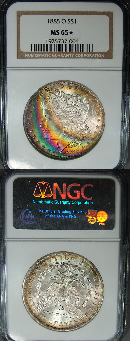 1885-O $1 NGC MS65* Monster Rainbow Toned Crescent