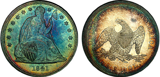 This outstanding Seated Dollar is in exceptional condition for the assigned grade of AU58 by NGC in an old fattie holder. The fields have light prooflike mirrors and are completely toned over in luxurious shades of lime, ocean blue, and magenta pink on the obverse and ringed on the reverse in a target pattern in shades of lime and steel blue with a golden-peach center. It is barely worth noting that there are some light wispy lines from a VERY old cleaning noted in non-distracting areas of the fields which limits the grade to AU58 and is completely acceptable at this level of preservation. Toned Seated Dollars rarely surface as they are highly prized because of their scarcity. It is much easier to find attractive toned Proof Seated Dollars and to find even those with amazing color are difficult and demand a high premium. Additionally, due to the extreme rarity of the proof 1841 Seated Dollar, this particular example, being somewhat prooflike and exhibiting colors typically found on Proof examples, would be a valuable addition to any Seated Dollar collector.