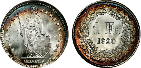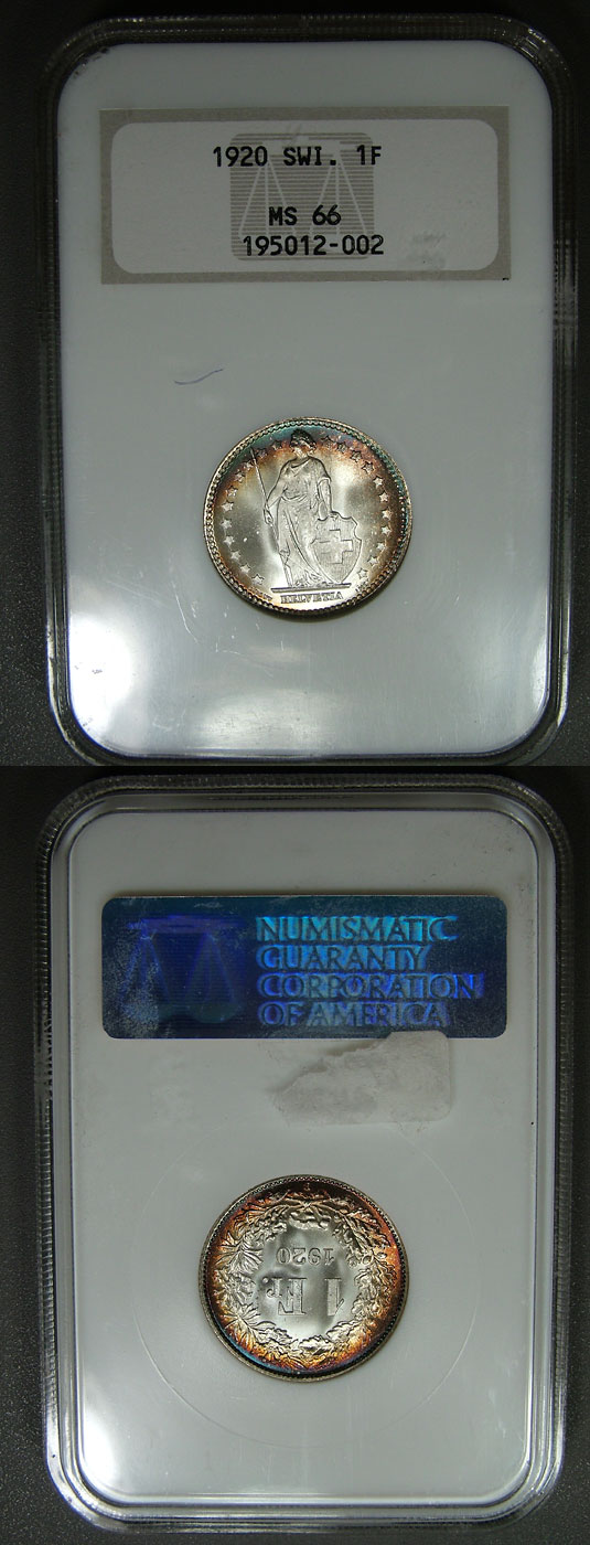 1920 1F NGC MS66 Beautifully Toned Premium Swiss Franc