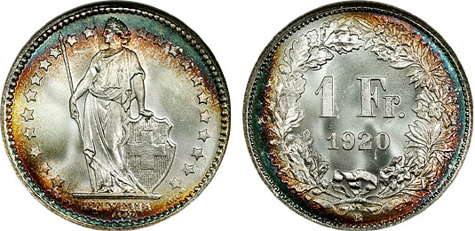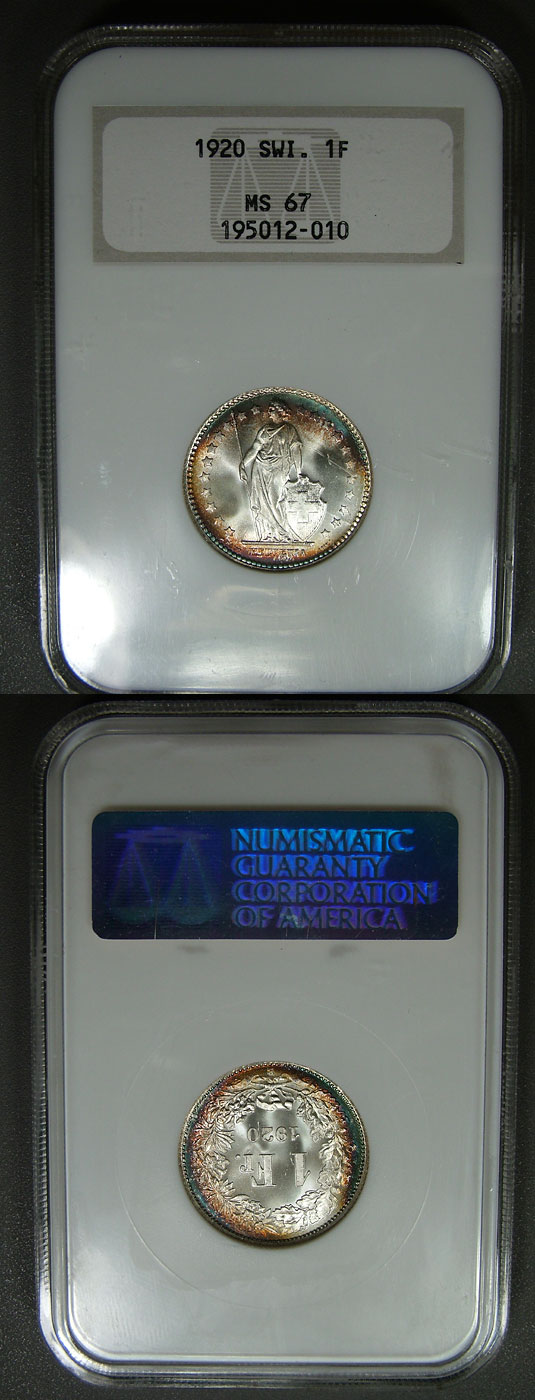 1920 1F NGC MS67 Beautifully Toned Superb Gem Swiss Franc