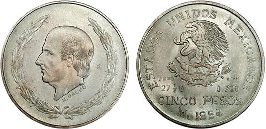 Key Date 1954 Mexico 5 Pesos is Gem Uncirculated. Frosted devices are well struck and are centered in problem free fields. Nice lustrous cartwheel effect. A lovely example.