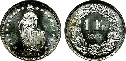 This remarkable cameo Swiss 1 Franc specimen coin exhibits deep watery fields and thick frost on the design and devices on both the obverse and reverse. This is a truly exceptional example which is housed in a VERY early generation NGC Fattie Green Label holder.