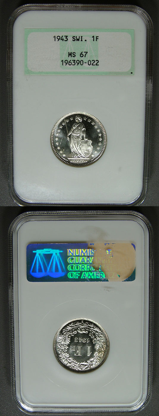 1943 1F Old Fattie NGC MS67 Cameo Swiss Franc - Specimen