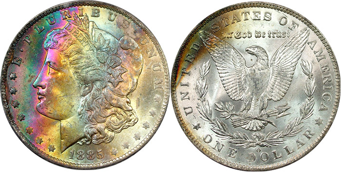 View the largest gallery of high-end and Monster rainbow toned Morgan dollars, an informational guide on how to tell natural vs. artificial toning, learn to price toned Morgans, view auction results of rainbow Morgans, and view what characteristics to look for in high-end toned rainbow Morgan dollars.