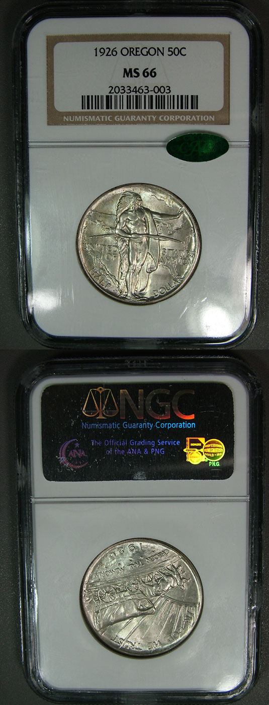 Highly lustrous 1926 50c NGC MS66 Oregon Commemorative Half Dollar is designated "CAC" Boldly struck up devices are awash in blazing cartwheel effect. A lovely soft pastel tone is evident. Exhibits great eye appeal. Boldly struck up devices are awash in blazing cartwheel effect. A lovely soft pastel tone is evident. Exhibits great eye appeal.