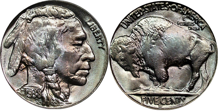 This extremely lustrous buffalo nickel is a pleasing coin to say the least. Light shades of icy blue intermingle with hues of pink and silvery lavender across both the obverse and reverse.