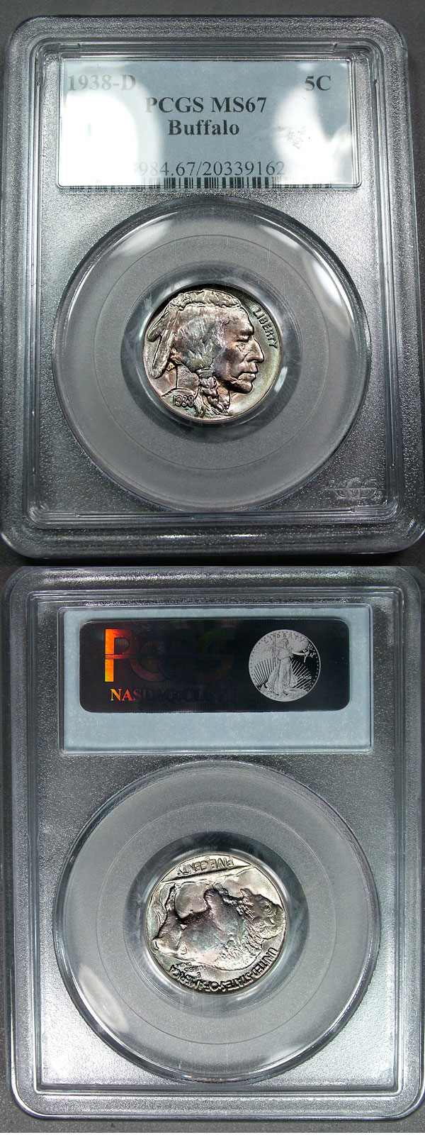 1938-D 5c PCGS MS67 Toned Lustrous Buffalo Nickel