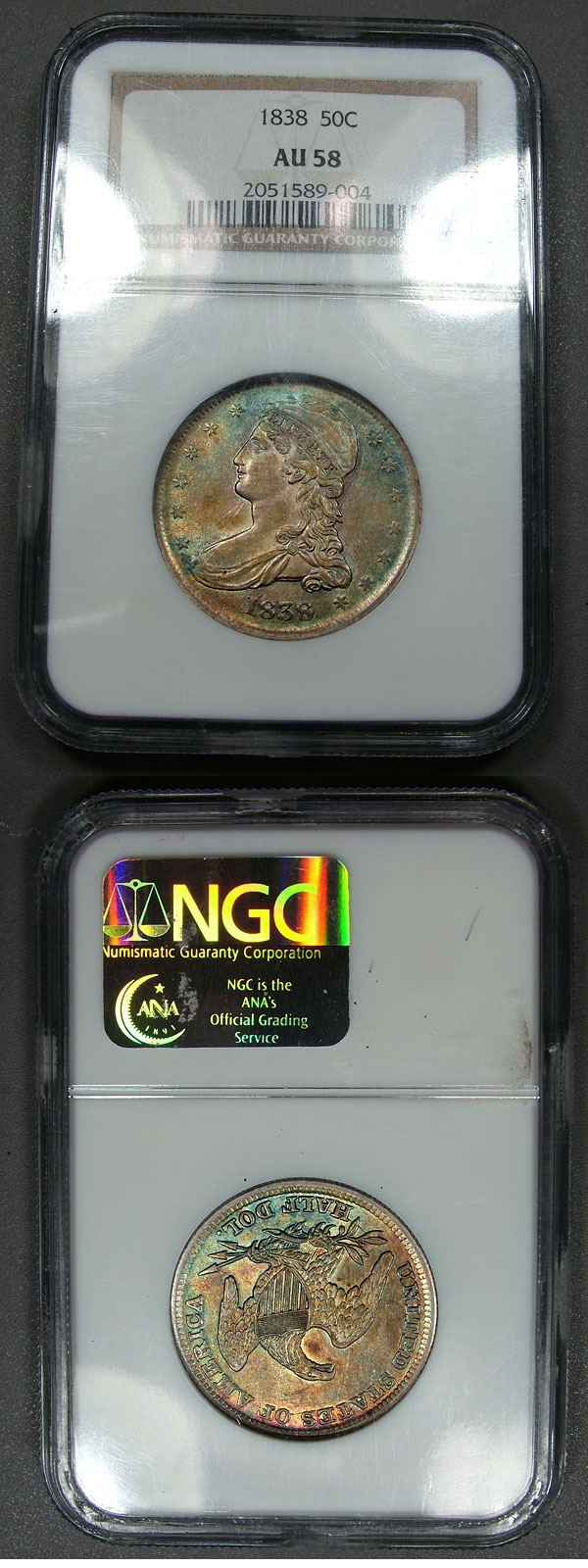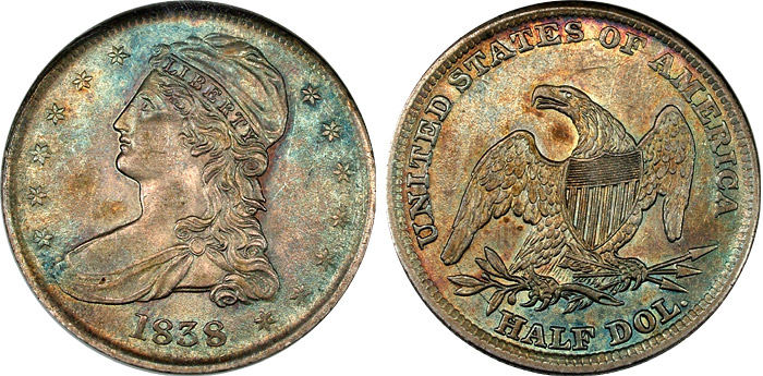 1838 50c NGC AU58 Mossy Gold Toned Bust Half - PQ