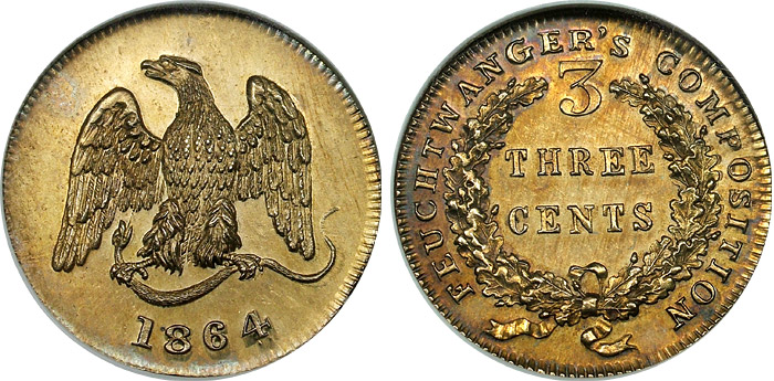R.6. "Feuchtwangers Composition," as is well known today, was actually a "German silver" variant that alloyed copper, nickel, and zinc. While Feuchtwangers initial one cent and three cent tokens date from 1837 and are generally linked with Hard Times tokens, the 1864-dated three cent tokens (which are die-linked to the 1837 originals) add a Civil War connection. Feuchtwangers three cent pieces of 1837 came in two varieties, this one with the New York arms on the obverse, and another showing an eagle in its place. Both varieties are scarce and eagerly sought by collectors.