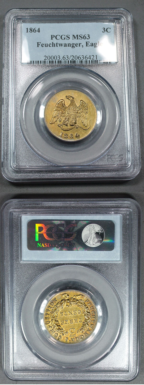 1864 3c PCGS MS63 Feutchtwanger Three Cent