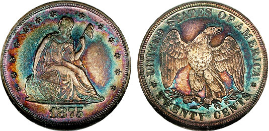 1875 20c NGC AU58 Monster Rainbow Twenty Cents - PQ++
