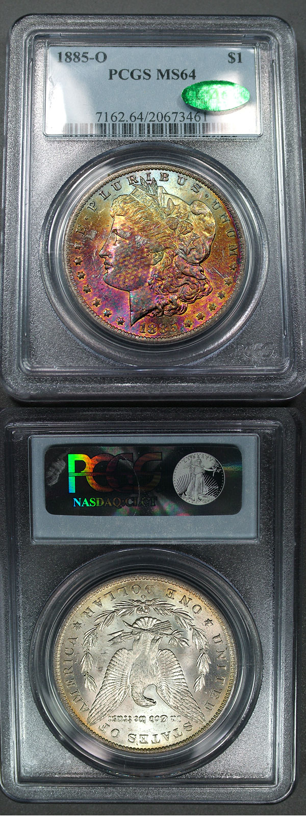 1885-O $1 PCGS MS64 CAC Bold Firery Textile Toned Morgan