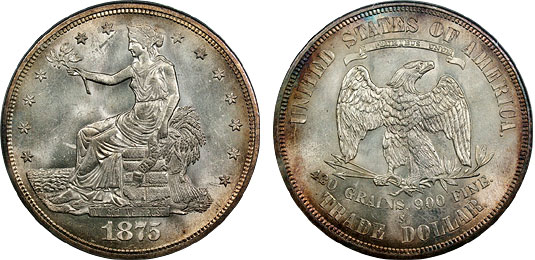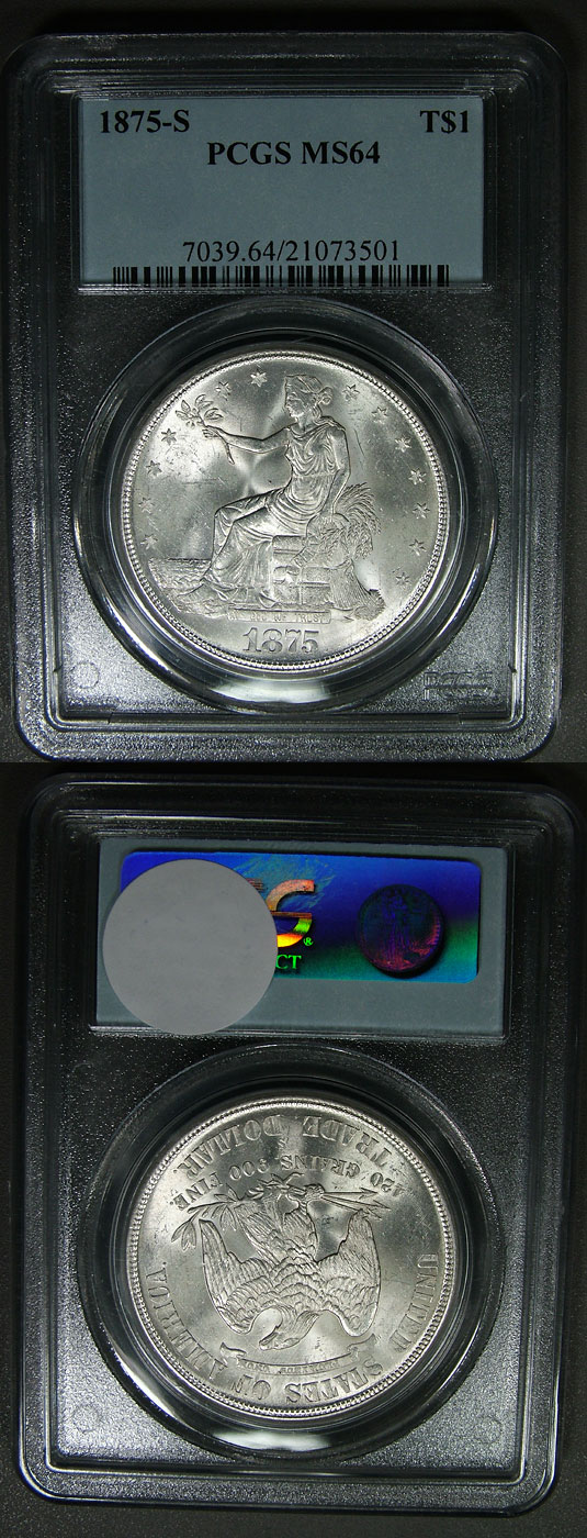 Super gem 1875-S $1 PCGS MS64 Trade Dollar is blazing! Blast white in appearance and super lustrous, this coin is near flawless! Devices are sharply struck and very well defined. Fields are in a high state of preservation. A beautiful, right out of the mint look. Wow!