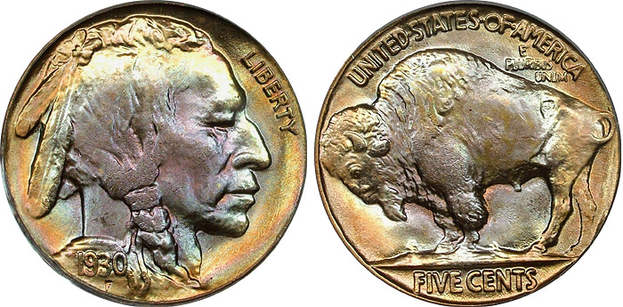 1930 5c PCGS MS66 Target Toned Rainbow Buffalo Nickel