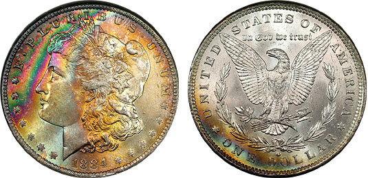 This wonderful Rainbow toned Morgan dollar exhibits a fabulous banded rainbow flowing across the obverse in shades of deep green, purple, magenta, royal blue, yellow, ice blue, and orange covering most of the obverse of this beautiful coin. On the reverse there is a touch of icy blue and gold toning while the rest is essentially white.