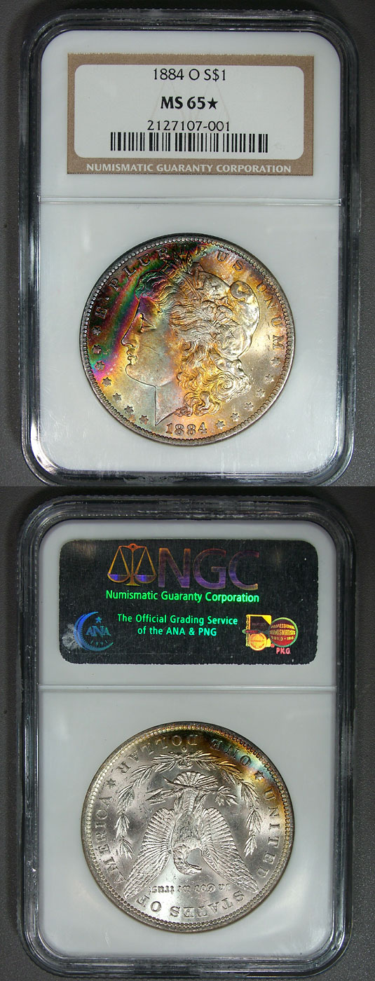 1884-O $1 NGC MS65* STAR Banded Rainbow Toned Morgan