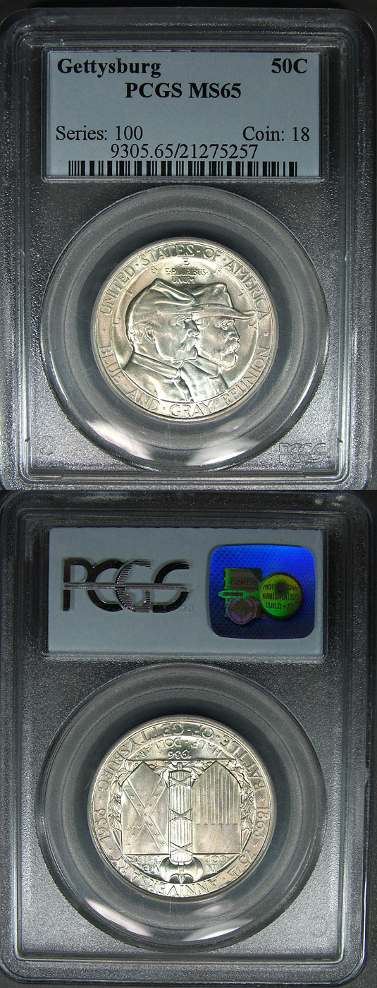 This beautiful, PQ Gettysburg commemorative is exceptionally well preserved and is much nicer than the average MS65. The shields are amazingly clean and the strike is outstanding. The combination of booming luster, original well-preserved surfaces, and a powerful strike is easily noted. If you don''t feel this coin is amazing for the assigned grade, feel free to return it for a full refund.