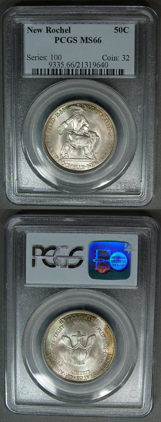 Shades anyone? This 1938 PCGS MS66 Toned New Rochelle Commemorative Silver Half Dollar exhibits blinding luster. Keenly struck motifs are swimming in flashy problem free fields. The cartwheel effect is extremely pleasing. Lovely subtle golden hues at rims swim in spots of sea green and pastel blues. This is a highly appealing and choice piece!
