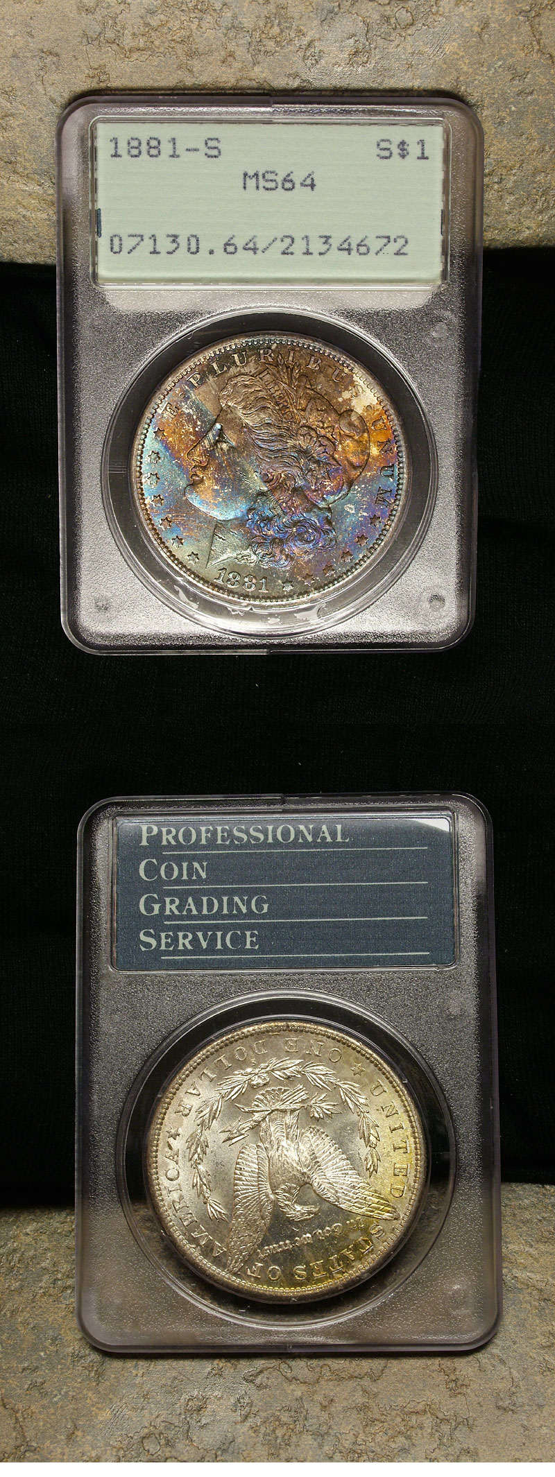 1881-S $1 PCGS MS64 Blue End Roll Rainbow Morgan Rattler