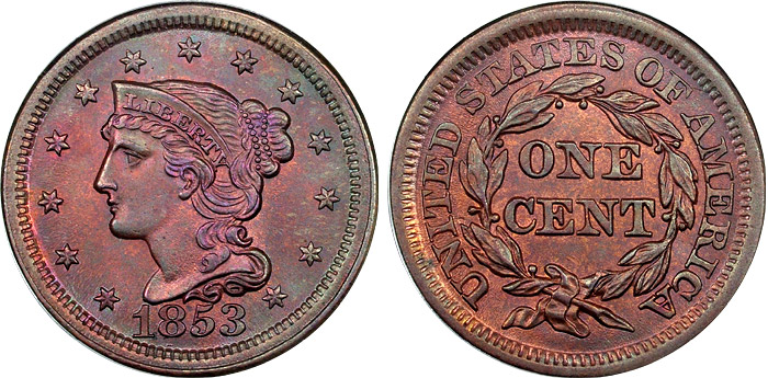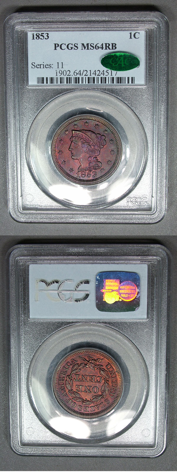 1853 1c PCGS MS64RB CAC Purdy Toned Coronet Cent