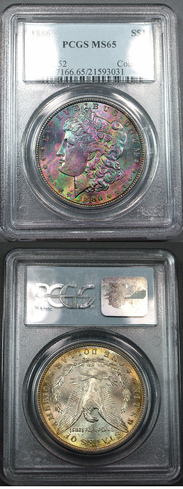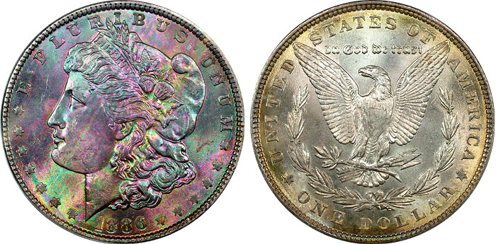 1886 $1 PCGS MS65 Textile Rainbow Toned Morgan
