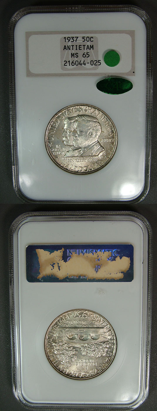 Lovely 1937 50c NGC MS65 Antietam Commemorative housed in old fattie holder and designated "CAC". Boldly struck devices swim in problem-free fields. Mostly white with subtle golden iridescence most notable on obverse. Lustrous cartwheel effect adds to the overall look.