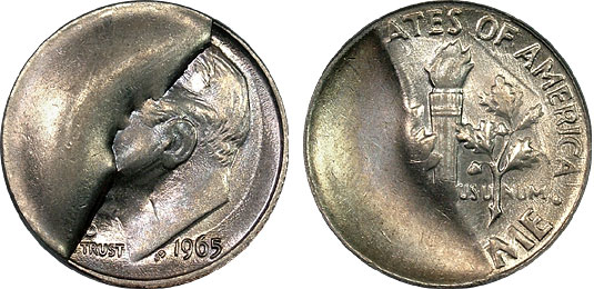 There are die cud errors, then there is this 1965 Roosevelt Dime Major Die Cud Break we affectionately refer to as "The Elephant Man." This extremely rare mint error also shows die clashing as Roosevelt's neck can be seen on the reverse. Devices are sharply struck and the coin maintains a highly lustrous look. Never has the Elephant Man looked so beautiful.