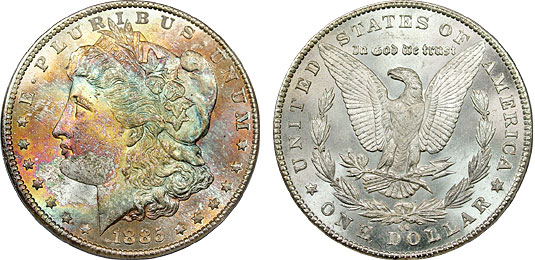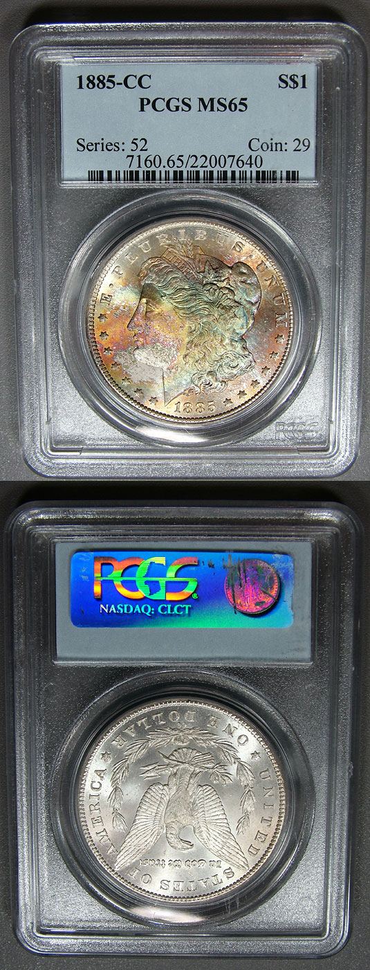 1885-CC $1 PCGS MS65 Sunset Toned Morgan Silver Dollar