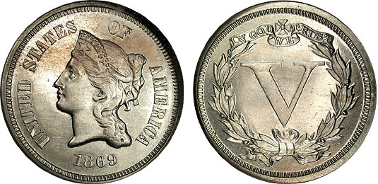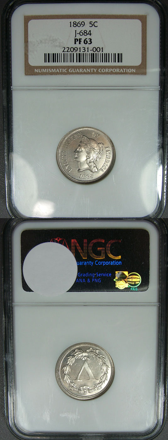 Aww, how cute. The three cent nickel design that was used on circulating coins from 1865 until 1889 is the basis for the design on this pattern nickel. If you held it side-by-side with a 3cn, this coin would look like it's big brother. Scarce and desirable 1869 5c NGC PF63 Longacre Pattern V Nickel: Judd 684, Rarity 5. The obverse design is similar to the adopted three cent nickel with the only change being a star added to Liberty's coronet. The reverse features a large Roman numeral `V' surrounded by a laurel wreath. A small Maltese cross centers the banded inscription "IN GOD WE TRUST" at noon on reverse. Struck in nickel with a plain edge the devices are frosty and the fields are quite reflective. A beautiful piece and highly desirable in such a state of preservation. A fine addition to the collection of any pattern collector.