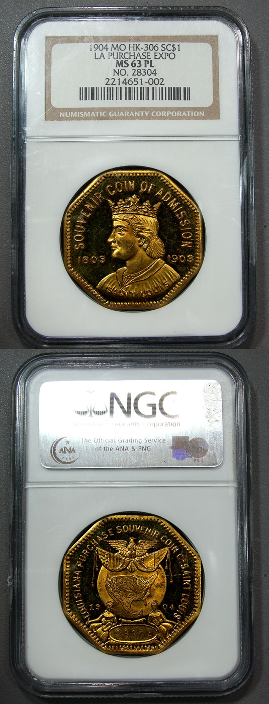 This beautiful Louisiana Purchase so-called dollar is numbered 28304 and certified by NGC as MS63 Prooflike.