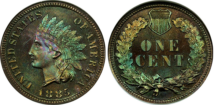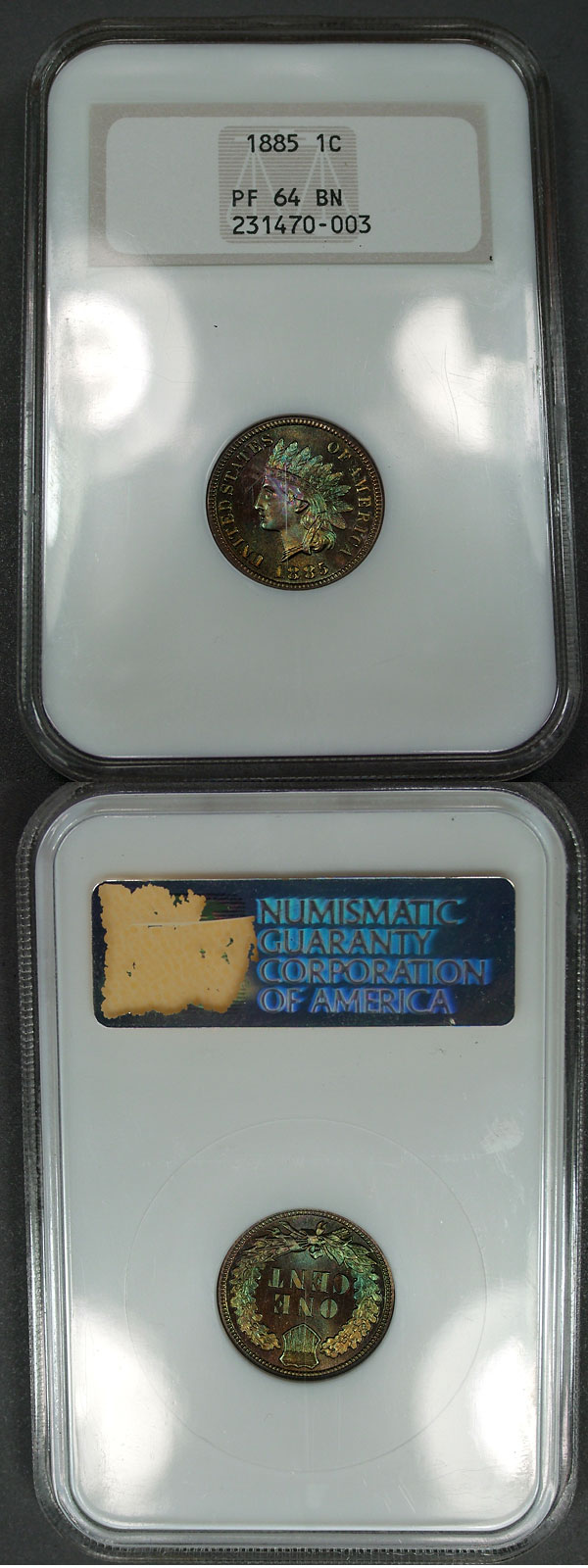 1885 1c NGC PF64BN Emerald Green Toned Proof Indian