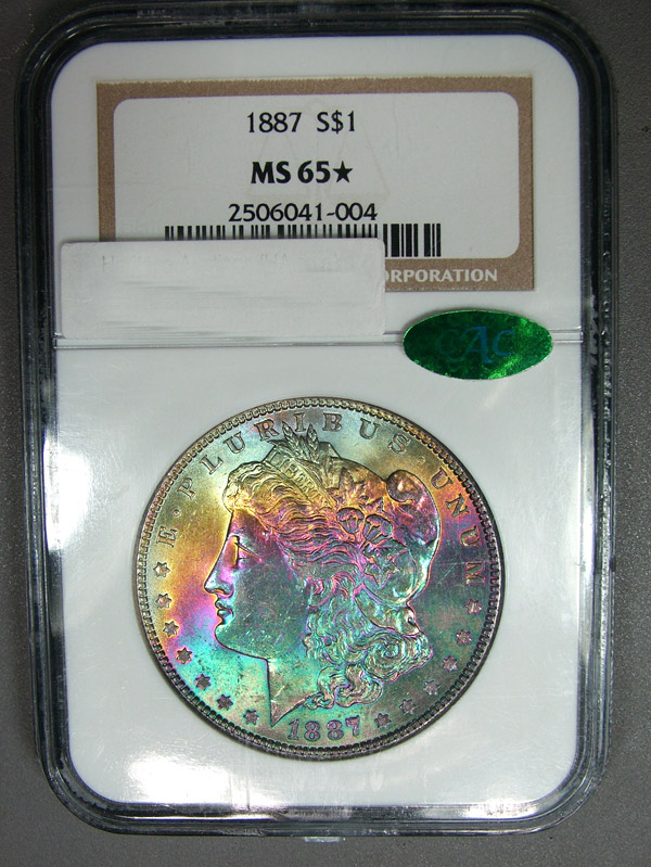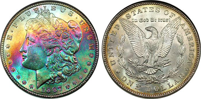 View the largest gallery of high-end and Monster rainbow toned Morgan dollars, an informational guide on how to tell natural vs. artificial toning, learn to price toned Morgans, view auction results of rainbow Morgans, and view what characteristics to look for in high-end toned rainbow Morgan dollars.