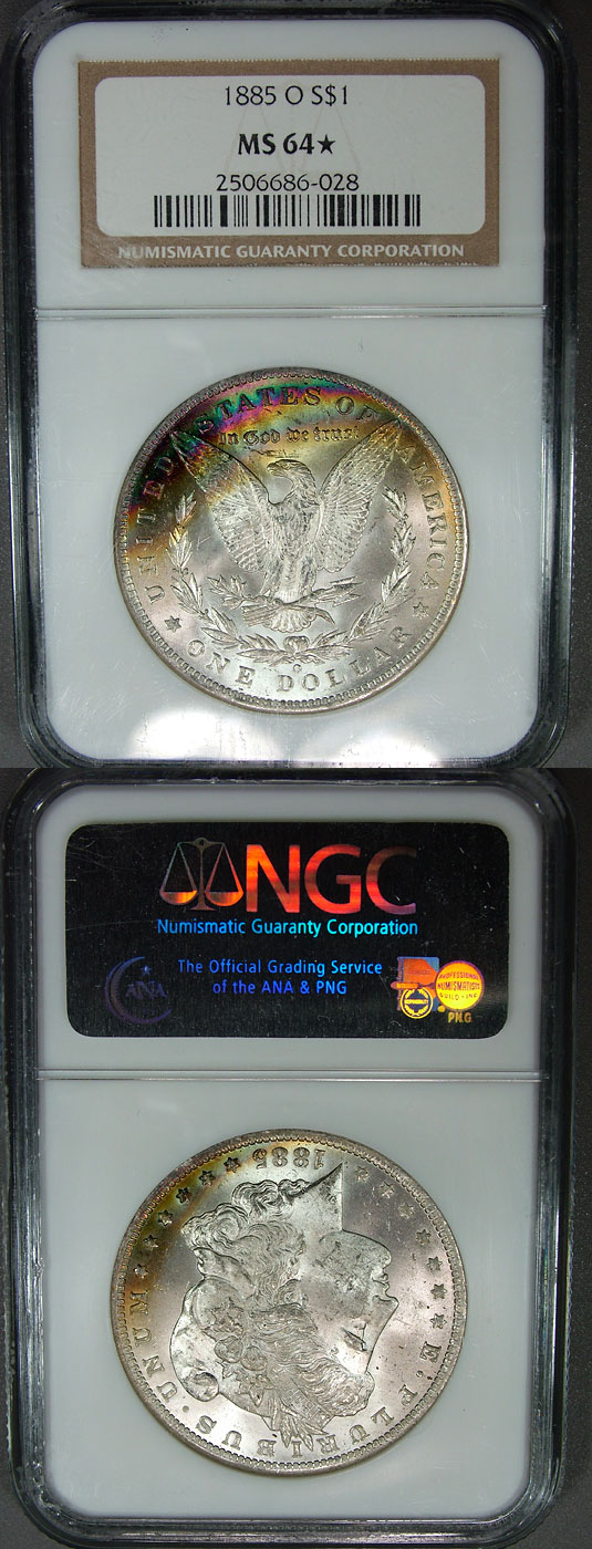 1885-O $1 NGC MS64* Rainbow Toned Morgan Dollar