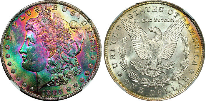 View the largest gallery of high-end and Monster rainbow toned Morgan dollars, an informational guide on how to tell natural vs. artificial toning, learn to price toned Morgans, view auction results of rainbow Morgans, and view what characteristics to look for in high-end toned rainbow Morgan dollars.