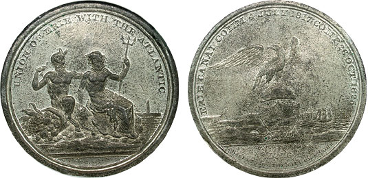 Obverse: Two full seated figures depicting Pan and Neptune, to r. of Pan is cornucopia, in background is lighthouse and sea, below microscopic R. Del (remainder illedible) W. Sc., above all, around Union of Erie with the Atlantic