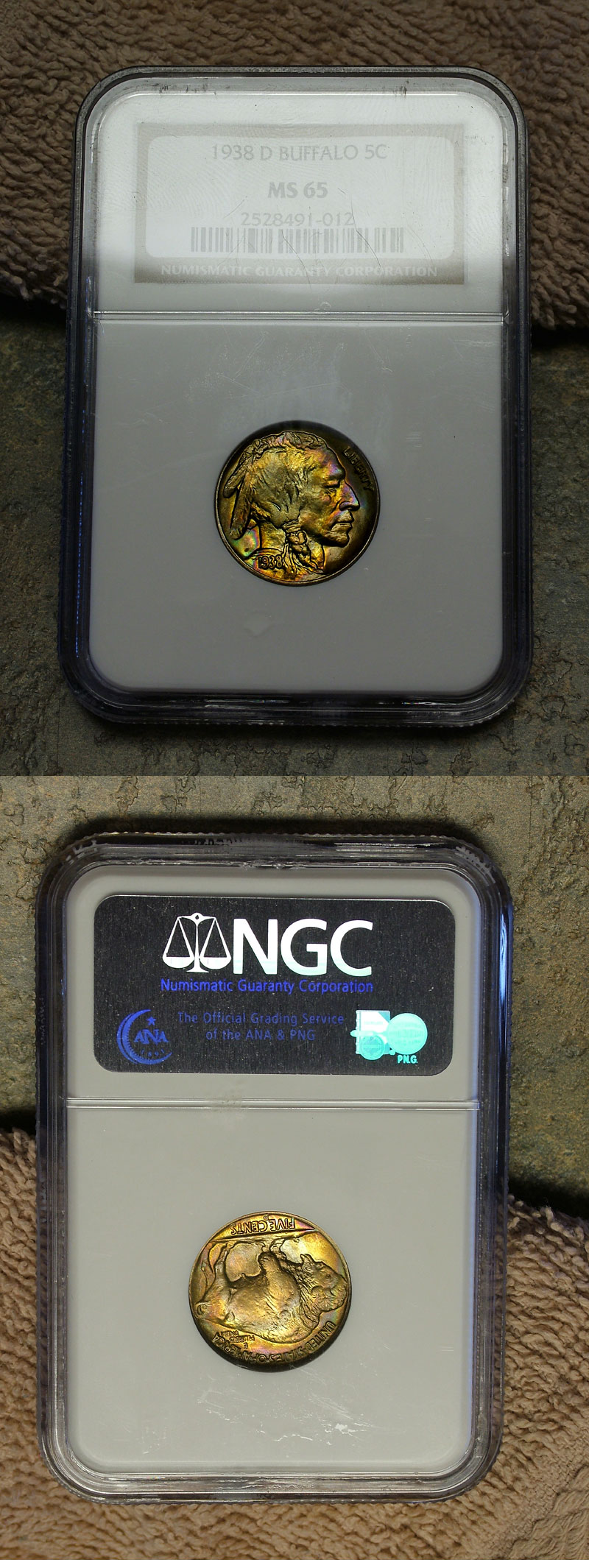 1938-D 5c NGC MS65 Superb Rainbow Toned Buffalo Nickel