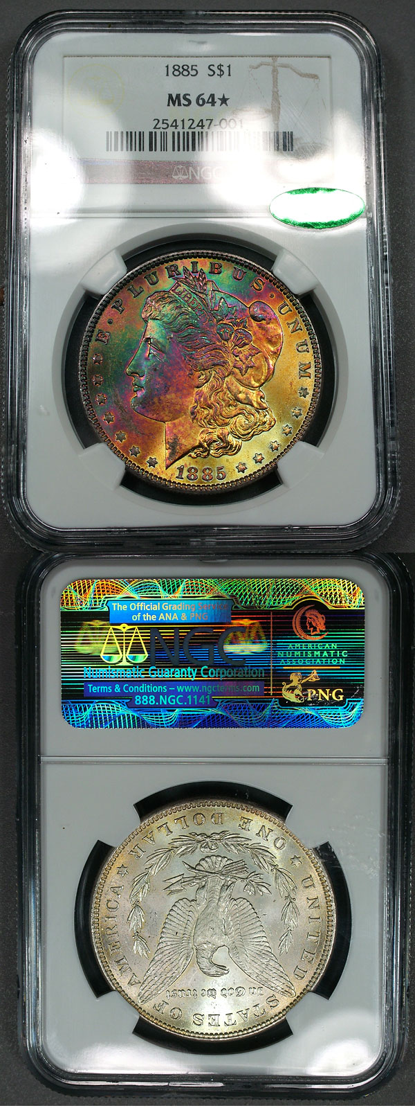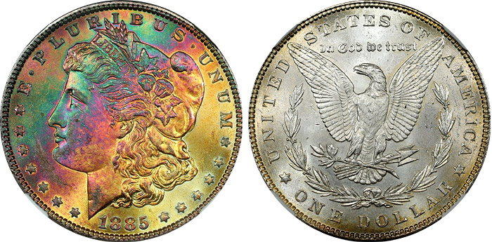 1885 $1 NGC MS64* STAR CAC Rainbow Toned Morgan