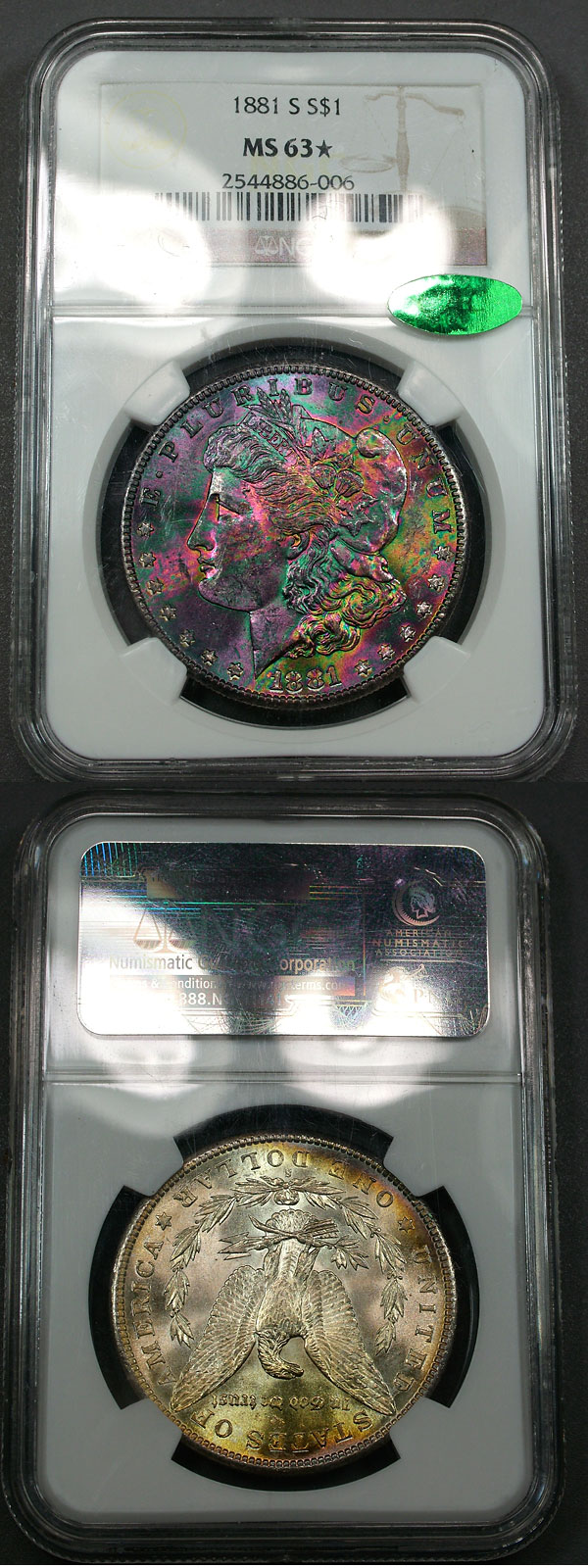 1881-S $1 NGC MS63* STAR CAC Rainbow Toned Morgan - Asteroid Belt