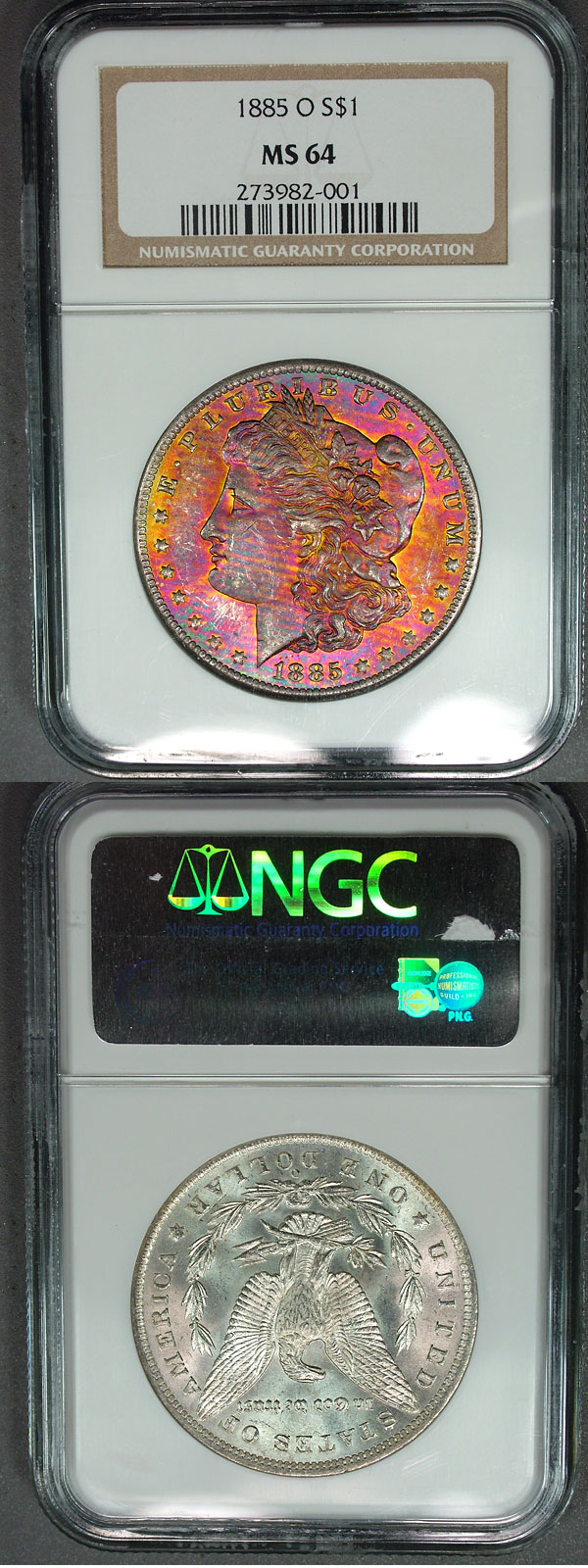 100 per cent textile covers the obverse of this amazingly toned Morgan dollar. The magenta shades covering the surface are dotted by bright yellow dots with hints of emerald green and royal blue near the lower rims.