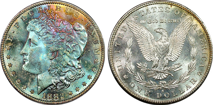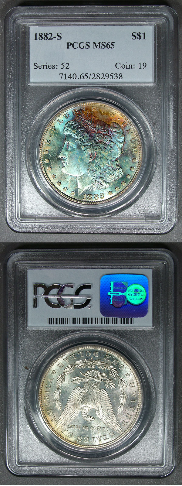 1882-S $1 PCGS MS65 Fire and Ice Rainbow Toned Morgan