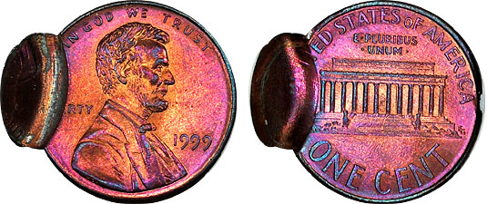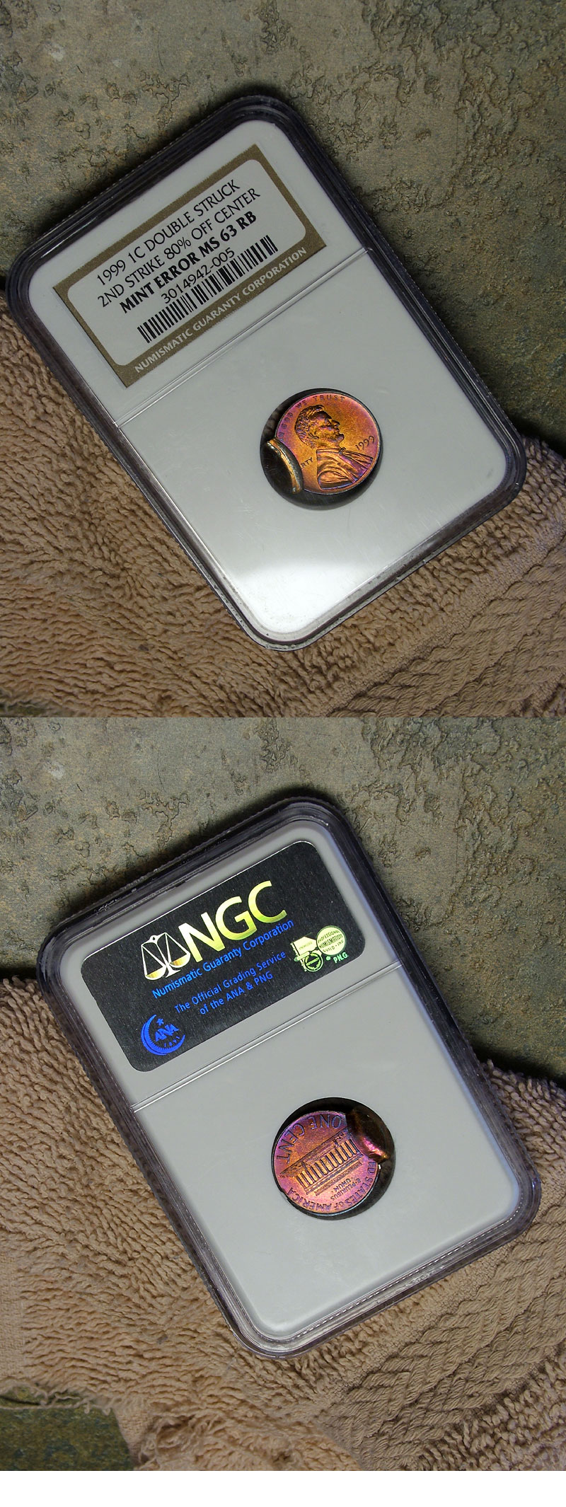 This magnificently toned Lincoln Cent was double struck with the 2nd strike 80% off center. The coin is uncirculated and is toned on both sides with beautiful sunset shades of pink-peach, deeper magenta, and steel blue. This coin was graded by NGC as MS63RB (Red-Brown) with certification number 3014942-005.