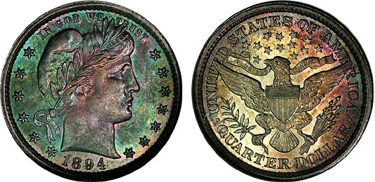 Wow! This 1894 25c NGC MS65 Barber Quarter is Monster Toned!!! Vibrant sea greens mix with gold, plums and sky blues on obverse. Reverse is a myriad of sunset perfection with sunny golds fading to burnt plums and greens. Lost in the color, the sharply struck design elements with are every bit gem BU. What a great looking coin!