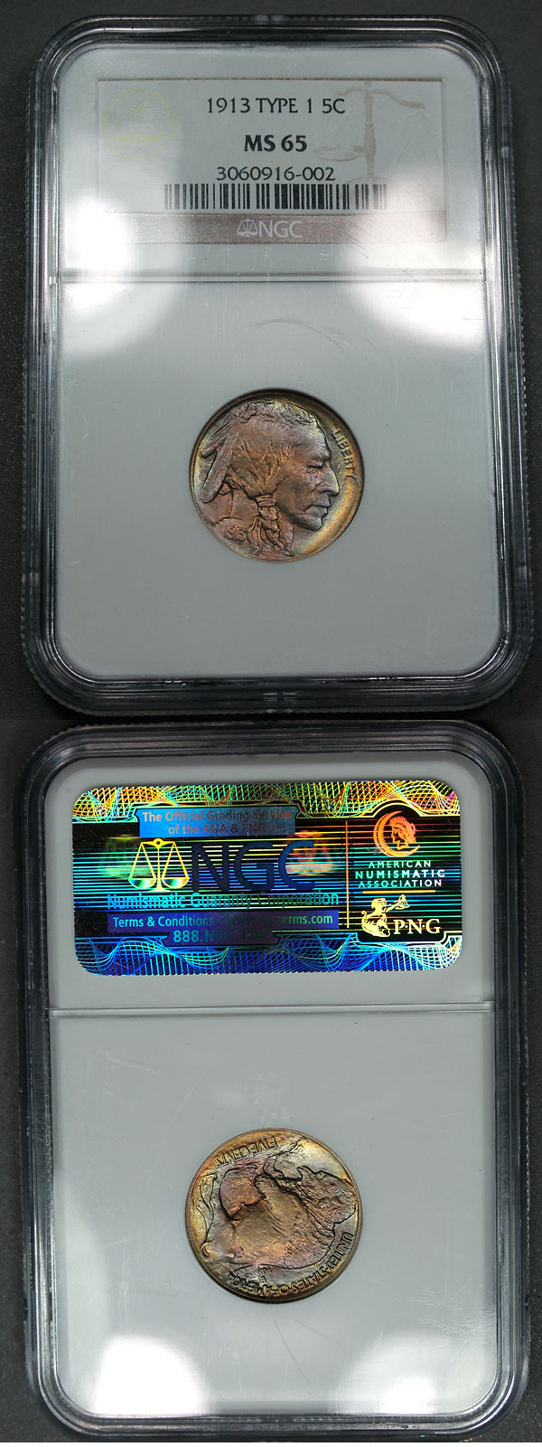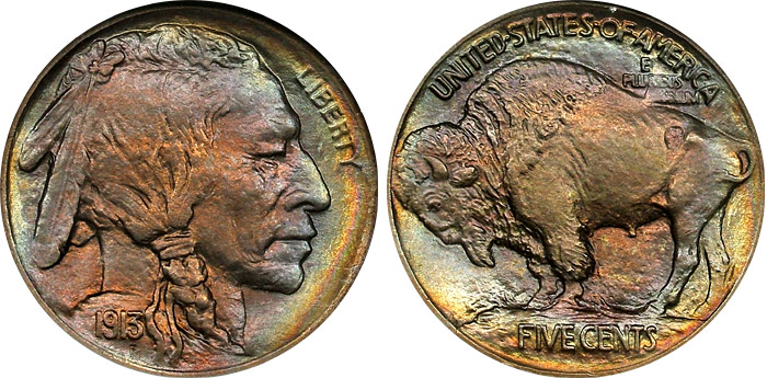 1913 5c NGC MS65 Type 1 Rainbow Toned Buffalo Nickel