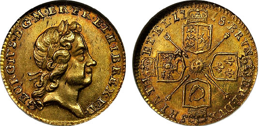 This 1/4G is extremely rare and is one of two attempts at a 1/4G by Great Britan. In 1762 another issue was produced but suffered the same fate as the early 1718 issue. These coins were too small and were vastly unpopular as higher units of spending power in such a tiny package. This particular example is in impeccable condition for the tiny mintage of this rare issue. The natural surfaces exhibit beautiful medium gold hues with coppery highlights. Heritage has only sold 1 of this rare issue and a googling of this particular coin produces very few results; all of which are circulated.