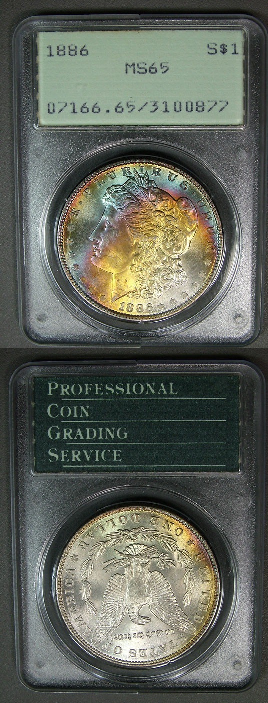 1886 $1 PCGS Rattler MS65 Sunset Rainbow Toned Morgan
